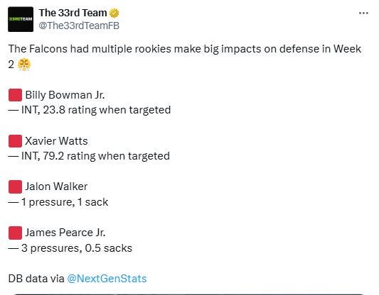 It was a Bijan Robinson game from the jump when he popped off a few big runs in the first quarter but other than that the ATL offense was stuck on 2nd gear. No WR over 50 yards and Penix threw for under 140. YUCK. The one thing I’m looking at when it comes to this game is that the Vikings defense is tough and willing to get after the QB. The Vikings have one of the highest blitz percentages in the league under Brian Flores. They neutralized the Vikings pass rush with 39 running plays. Penix executed the gameplan that was set up and didn’t make any costly mistakes. This off the heels of a near comeback vs Tampa Bay where Penix threw for 298 yards and Koo missed a game-tying FG as time expired. ALSO their defense is playing tough. Rookies are making an impact early which is a good sign.