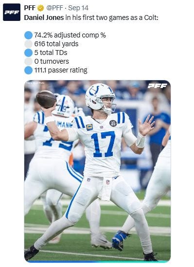 I thought at the beginning of the season that Herbert was going to be playing game-manager QB like Harbaugh QB’s tend to play. Through 2 games Herbert has 560 yards 5TD’s and 0 INT’s and completing 72% of his passes. To everyone’s surprise they’re letting Justin cook.