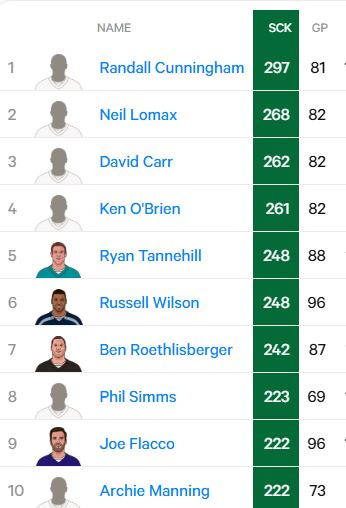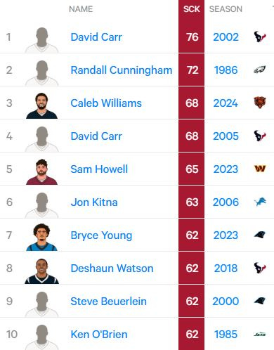 In 2021 he had 51 sacks in a season - seems high, until you look at the leaders in sacks taken in one season, and realize he’s not even close. PS- poor David Carr