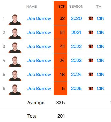 Burrow has 201 sacks taken (ayo) through six NFL seasons. The math cheats a little because he only played 1.5 games in 2025 let’s take a look at his sacks by season